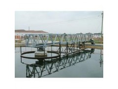 污水从池中心的进水管经导流筒扩散后,均匀地向周边呈辐射状流出,呈悬浮状的污泥经沉淀后沉积于池底,上清液通过溢流堰板由出水槽排出池外,污泥刮板由池周刮向中心集泥槽,依靠池内水压通过排泥管排出池外。主梁在周边驱动装置的带动下,以中心旋转支座为轴心沿池顶以2.0m/min线速度行驶,主梁下部连接支架、污泥刮泥板等。近液面处设置浮渣刮板,沿中心稳流筒延伸至铰链式刮渣耙,当主梁旋转时,浮渣刮板将液面的浮渣由池中心撇向池周,收集在铰链式刮渣耙区内,收集的浮渣随主机在池周运动至撇渣斗,通过刮渣耙的铰链活动刮至撇渣斗内,排至池外。
