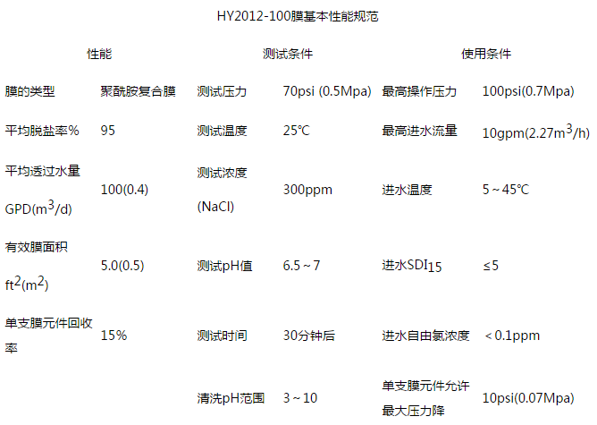 HY2012-100家用膜是海德能公司研制开发的用于自来水(或达到生活饮用水水质标准的原水)的脱盐的超低压芳香族聚酰胺复合膜元件。其脱盐率可达95%。从而出水水质高,经济实用性强。