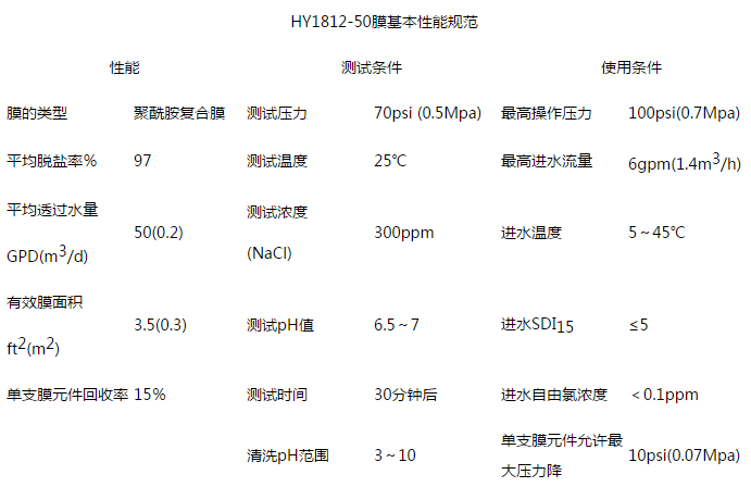 HY1812-50家用膜是海德能公司研制开发的用于自来水(或达到生活饮用水水质标准的原水)的脱盐的超低压芳香族聚酰胺复合膜元件。其脱盐率可达97%。因而出水水质高,经济实用性强。