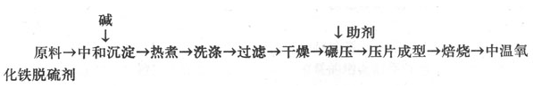 中温氧化铁采用沉淀法制备,其间添加部分助剂,经过成型后锻烧,脱硫剂制造工艺流程如下图所示: