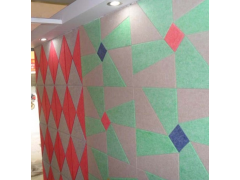 聚酯纤维吸音板有40多种颜色,可以拼成各种图案。表面形状有平面、方块(马赛克状)、宽条、细条。板材可弯成曲面形状。可使室内体形设计更加灵活多变,富有效果。甚至可以将艺术画通过电脑复印在聚酯纤维吸音板上。