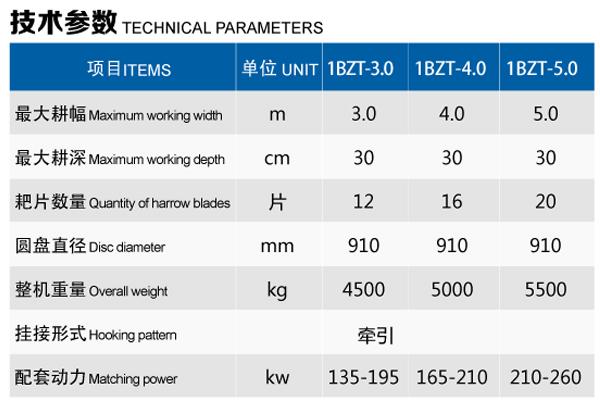配套动力:200~300马力拖拉机,工作宽度3米至5米。