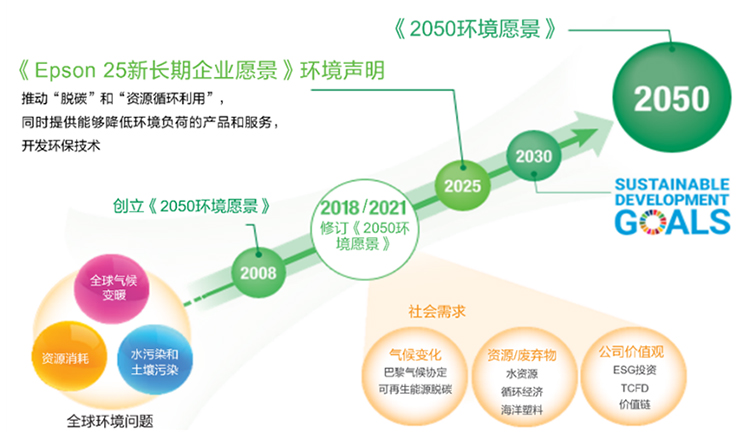 自公司成立以来,爱普生人一直在发挥创造力,挑战自我,不断开发和精进“省、小、精”技术,为客户提供超预期的产品和服务。在2008年,爱普生发布《2050环境愿景》,阐述了基于自身技术、产品和服务与商业伙伴建立协同效应、为创造一个更加和谐美好的世界做出贡献的行动。在2021年,爱普生进一步修订了《2050环境愿景》,完善和明确2050年将达成碳负排放和地下资源零消耗*1的具体目标。