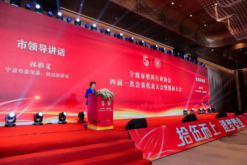 宁波市委常委、统战部部长林雅莲作重要讲话。她首先对宁波塑协四届一次会员代表大会的成功召开和选举产生新一届领导班子表示祝贺。她指出,宁波是国内重要的塑料生产制造基地和贸易集散地,形成了涵盖塑料原料及改性、塑料加工、塑料机械及模具、塑料助剂等完整的产业链体系,产业集群效应日益凸显。她充分肯定宁波塑协在促进交流合作、推动技术创新、赋能转型升级等方面取得的成效,希望协会锚定建设中国特色一流协会的目标,强化政治引领,勇挑创新重任,提升服务水平,助推塑料产业链高质量发展、助力宁波民营经济竞争力提升,为宁波宁波持续深化“六大变革”、奋力“打造六个之都”、在中国式现代化新征程上实干先行作出新的更大贡献。