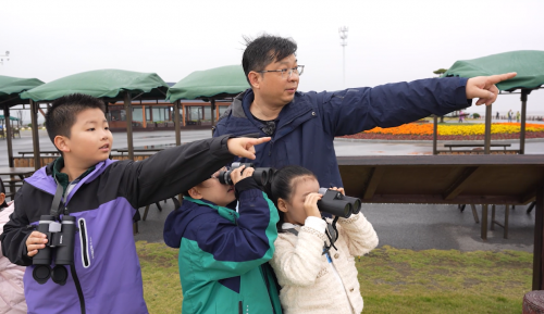 专家张华彬博士指导孩子们注意观察滩涂上各种鸟类的足迹,通过看这些足迹大致可以判断是哪些鸟类以及鸟类在逐步迁徙的路线和方向。回到岸上,教孩子们通过高倍望远镜看鸟类,与当时滩涂的足迹对应起来,让孩子们更直观里了解到“条子泥”湿地上的鸟的类型以及“东亚-澳大利西亚迁飞通道”对全球生态保护的意义。
