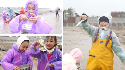 黄渤海湿地这片水土丰饶、物种纷繁的绮丽舞台上,无数独特的环境要素交织律动,在杨洪燕博士及李凌骜研究员的带领下,孩子们深入条子泥湿地,穿上专业道具服装,开始了底栖生物的挖掘。正值当日受寒流影响的极具天气,为本次的科考活动增加了考验。孩子们不畏风雨,用铲子挖掘湿地的滩涂,发现了梭子蟹、贝壳类等底栖生物,并用专业的密封袋子装置带回实验室准备。
