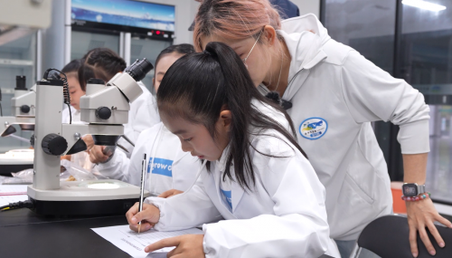 随后,李凌骜研究员带着孩子们在条子泥湿地挖掘的底栖生物,在实验室教孩子们如何使用显微镜观察,把挖掘的底栖生物都做成标本,了解生物和水质的关系。
