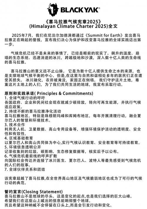 此次“Summit for Earth”峰会以“共享危机、共寻方案”为核心,深度聚焦喜马拉雅气候困境,并最终形成《喜马拉雅气候宪章2025》。BLACKYAK布来亚克等四家主办机构共同签署宪章,明确七大行动方向: