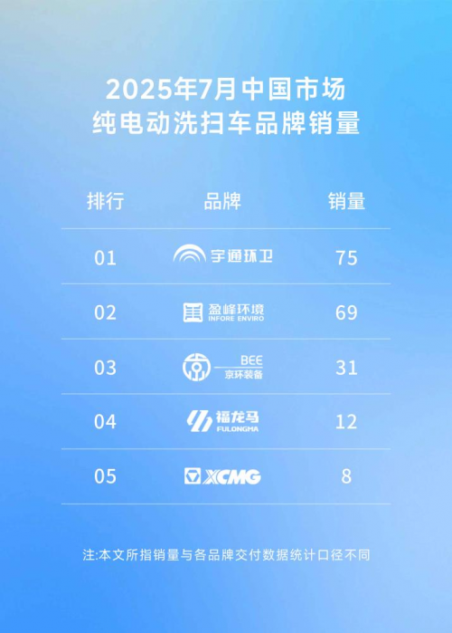 22025年7月中国市场纯电动洗扫车品牌销量榜单中显示,宇通环卫凭借卓越的产品力与市场表现,其纯电动洗扫车销量位居首位,盈峰环境紧随其后,位列第二。