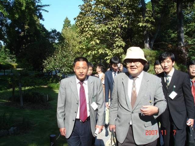 2007年11月7日,孙发政(左)参观日本国会大厦与日本前国会议员、东京农业大学岩本庄太教授(中)交流。