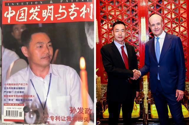 左:2004年孙发政被选为封面人物。 右:2025年4月孙发政会见欧盟前主席、瑞典前首相弗雷德里克·赖因费尔特。
