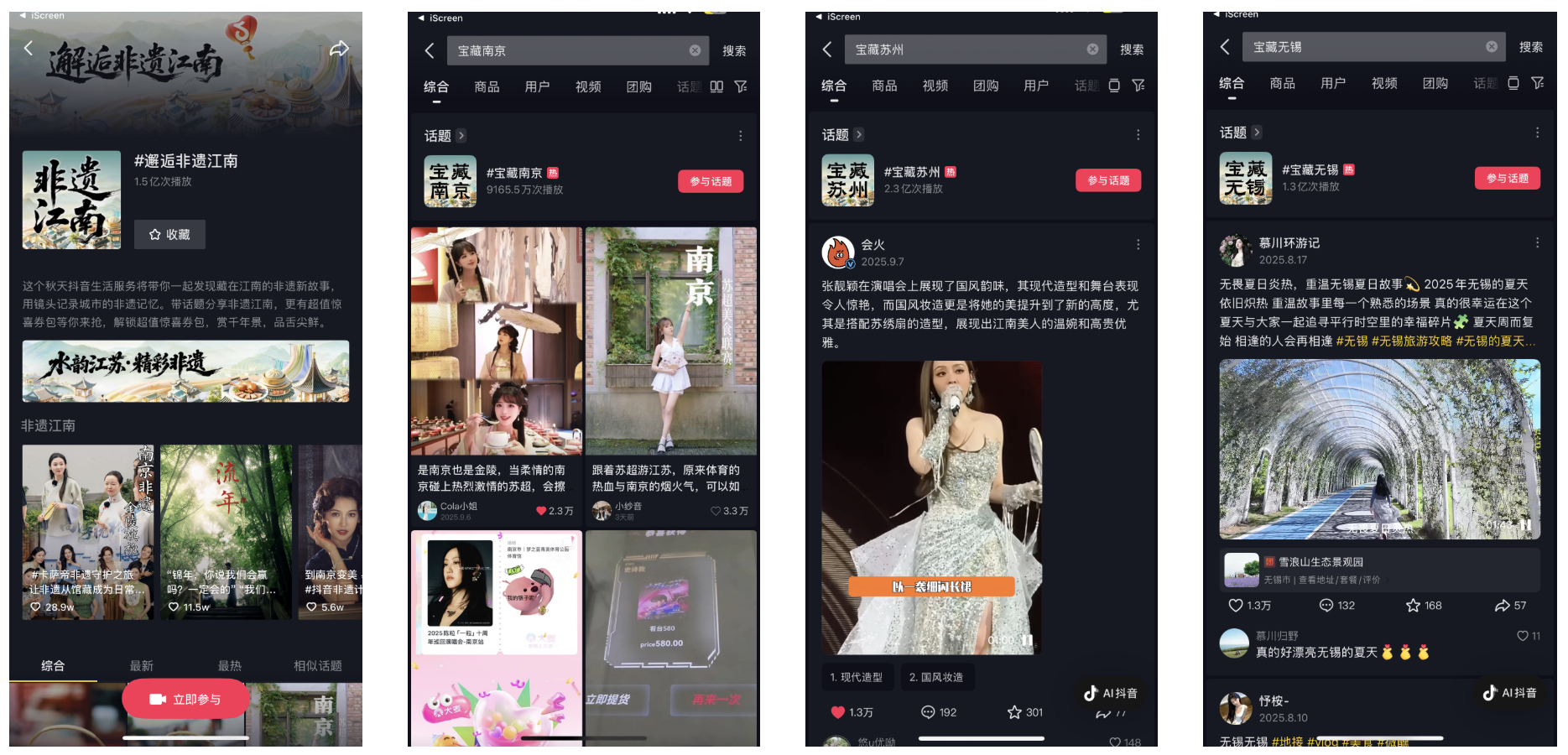 值得注意的是,活动期间,在“宝藏南京”“宝藏苏州”“宝藏无锡”三城核心话题基础上,平台持续叠加明星、美食、国庆等同城热点话题词,进一步强化内容吸引力。在话题引导与明星效应的驱动下,用户不仅主动打卡主题点位,深度参与非遗体验,更通过短视频内容分享赢取官方流量扶持,进而反哺传播链路。这些UGC内容依托同城热榜持续发酵,形成“打卡-分享-再打卡”的裂变循环与“自来水式”传播,推动流量从“平台推动”向“用户裂变”升级,实现滚雪球式增长。