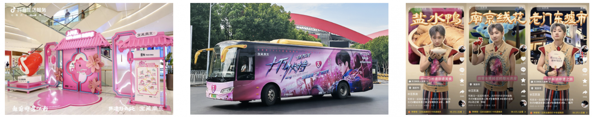 南京场则以汪苏泷演唱会为核心,线下深度联动其个人IP形象“素龙”,通过在金鹰商场布设主题装置、发起痛车全城巡游、联动城市大屏高频曝光等多元形式,精准激活年轻客群;线上同步释放“素龙”城市主题海报、系列短视频,及汪苏泷体验南京非遗种草视频 ,以“明星同款”非遗体验场景拉近距离,成功催生#跟着素龙打卡非遗南京、#汪苏泷邀你体验南京非遗 两大话题冲上同城热榜和种草榜。流量红利进一步转化为消费动能,推动合作门店在活动三天内支付金额、扫码核销量环比分别提升26.65%、27.08%,为合作商家带来了实打实的效益增长。