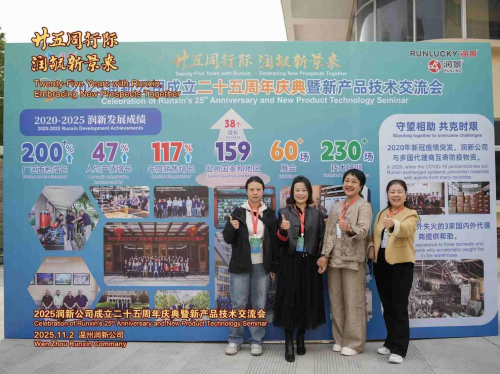 11月2日,润新公司以“廿五同行际,润毓新景来”为主题举办成立二十五周年庆典暨新产品技术交流会,来自美国、墨西哥、法国、西班牙、波兰、俄罗斯、匈牙利、爱尔兰、比利时、阿根廷、多米尼加、危地马拉、毛里求斯、南非、埃及、泰国、马来西亚、约旦、菲律宾、印度尼西亚、伊朗、孟加拉国、斯里兰卡、印度等20多个国家和国内各地的300多名客商参加活动。