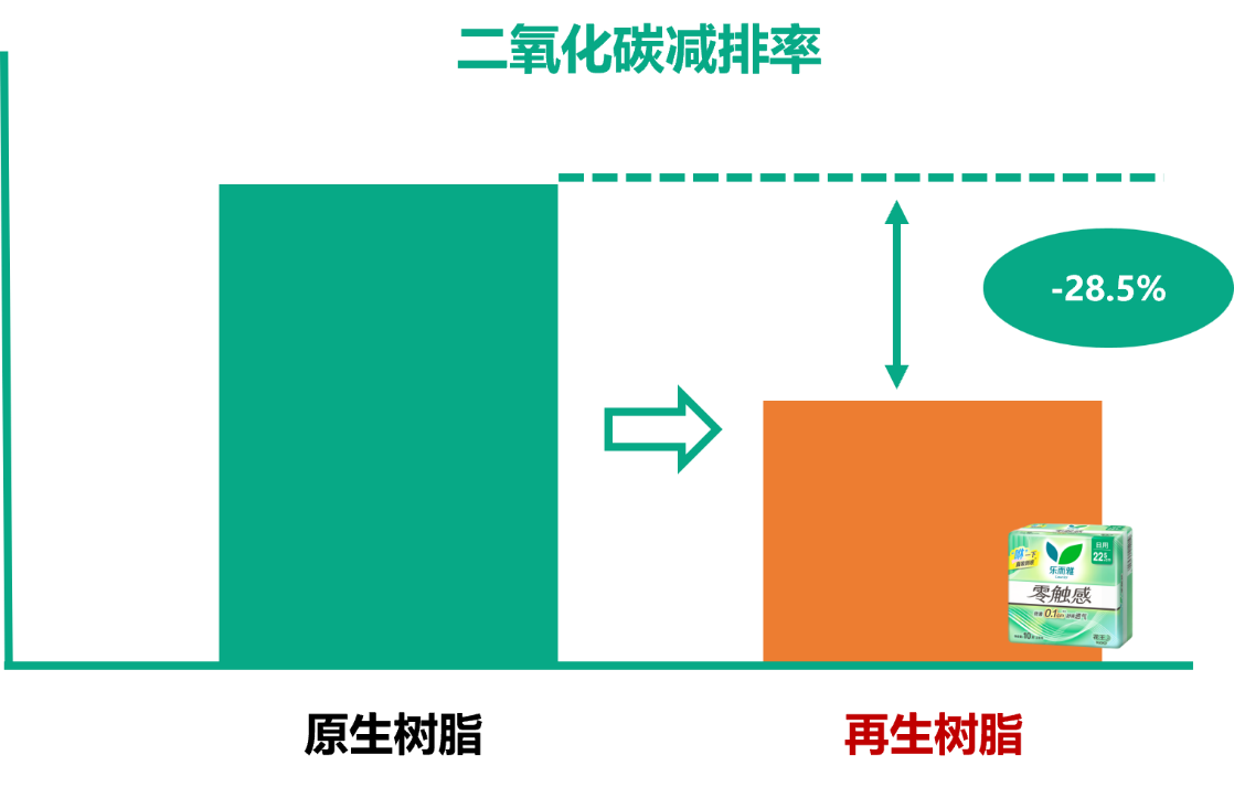 面对再生材料在性能、外观及安全性上可能存在的挑战,花王(中国)进行了多维度、系统性的科学实验。通过尖端材料科学与工艺技术的融合,确保了所用再生树脂在物理性能、外观质感以及卫生安全标准上,与原生树脂保持高度一致,碳减排率相较此前使用的原生树脂可达28.5%。此项“再生树脂技术在卫生巾包装袋中应用设计”已全面应用于乐而雅零触感卫生巾外包装,形成了贯穿产品线的环保实践体系。