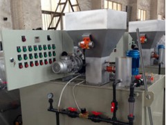 配制溶液从配制槽经熟化槽再进入储存槽,当储存槽液位处于高位时,配制过程自动停止,当溶液下降到低液位时,自动启动配料过程。配制槽和熟化槽均设置搅拌器,充分保证药剂的稀释和熟化。配制流量及浓度可通过调节进水流量和调节螺旋轴转速来确定。