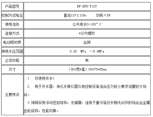 BF-DFD-T12V 电动阀全铜设计制造,低水压设计,质量稳定可靠,使用寿命长,适用于用开水器,净化水等仪器仪表控制设备适合压力较小要求流量较大的场合,为节水控制器配套之理想产品。