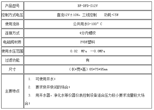 BF-DFD-S12V 电动阀PVDF塑料设计制造,快开快闭使用寿命长,低水压设计,质量稳定可靠,适用于用开水器,净化水等仪器仪表控制设备适合压力较小要求流量较大的场合,为节水控制器配套之理想产品。