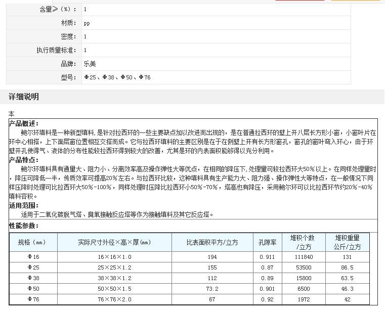 乐美Ф25、Ф38、Ф50、Ф76鲍尔环