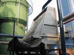 水力筛主体为由楔形钢棒经精密制成的不锈钢弧形或平面过滤筛面,待处理废水通过溢流堰均匀分布到倾斜筛面上,由于筛网表面间隙小、平滑,背面间隙大,排水顺畅,不易阻塞;固态物质被截留,过滤后的水从筛板缝隙中流出,同时在水力作用下,固态物质被推到筛板下端排出,从而达到固液分离目的。