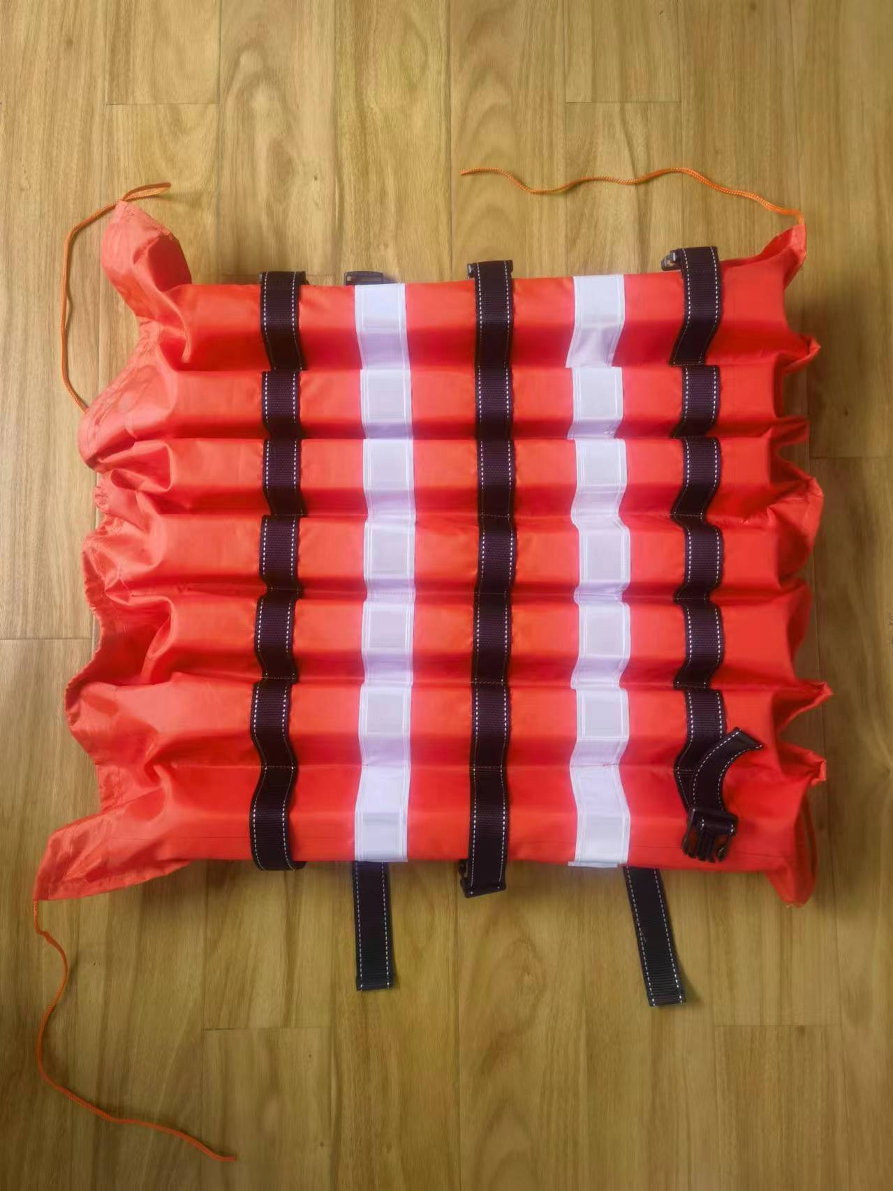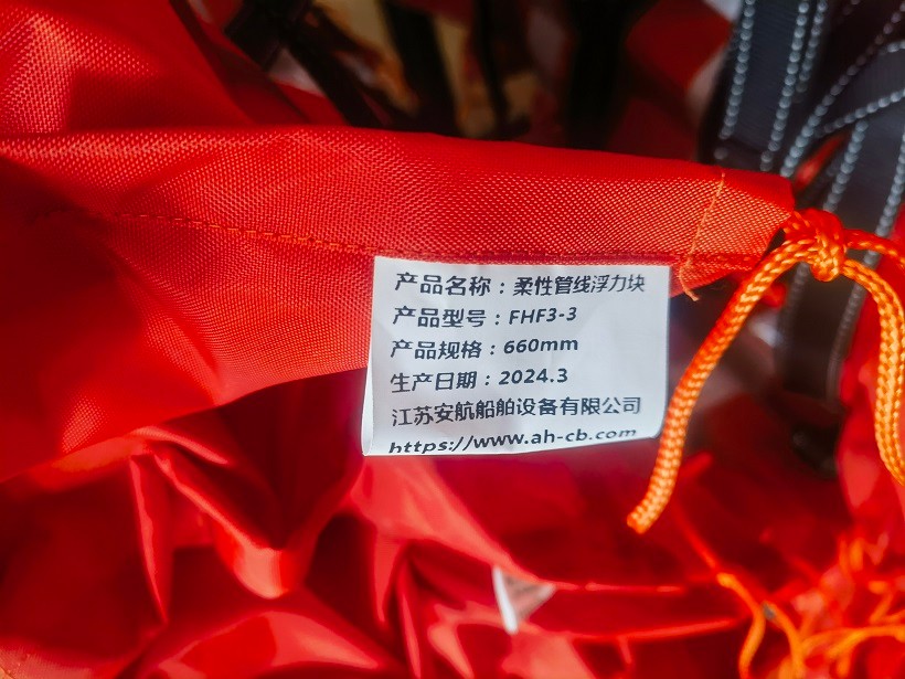 用4"管线安装;浮力块长度660mm;每块净浮力大于17kg;浮力块采用软质浮性材料填充,且采用分隔式的填充设计;内部有2条松紧带固定,外部三条可调节的松紧带每固定;两端附带系绳确保安装后收紧;该浮力块须为柔软材质,能紧贴弯曲的管线表面,防止使用时随管线滑脱;浮力块外表面须缝制2条不易脱落的环形反光带,