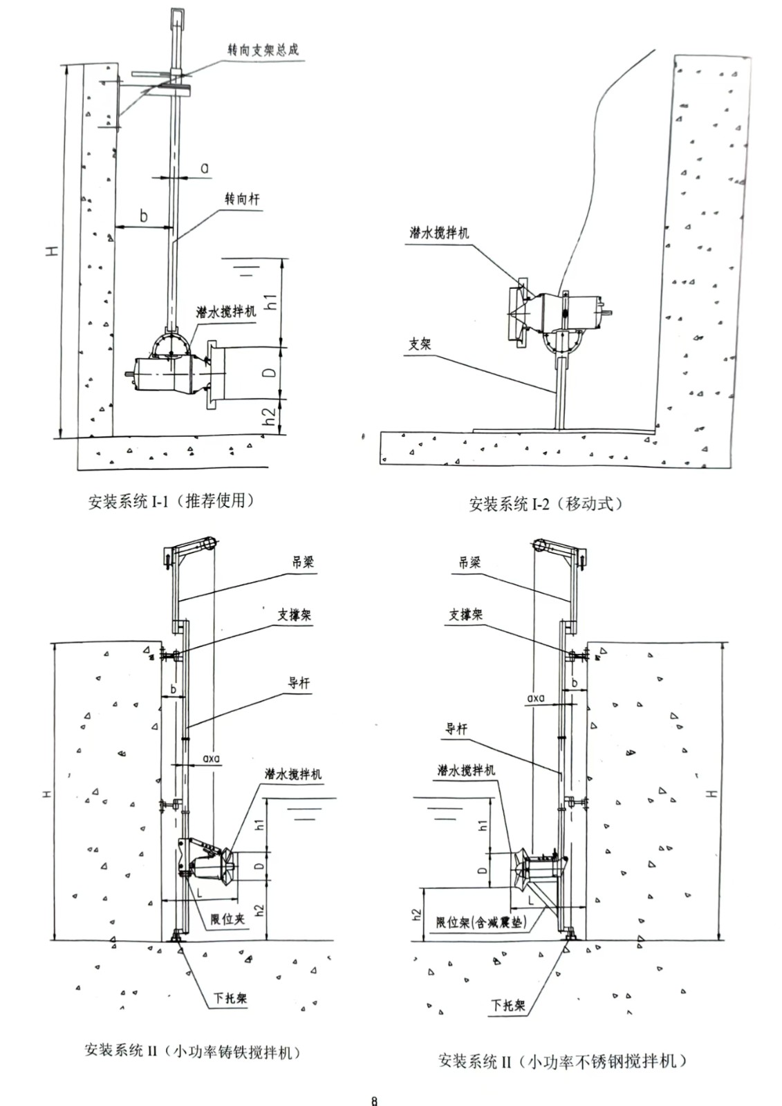 潜水搅拌机的潜水深度可以根据需要进行垂直方向的调节。吊架座、支撑架和下托架与池的联结均采用与预埋件焊接固定。客户订货时,请提供池深(H),以便我公司加工时确定导杆尺寸及支撑架的数量。安装系统的材质采用不锈钢(或碳钢)制造。起吊装置除吊架座外,数台搅拌机可共用一套。为方便搅拌机安装及起吊,应在起吊位置的护栏上开活动门。